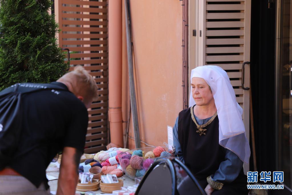 7月1日,一名身着中世纪风格服装的摊主在芬兰图尔库举行的“中世纪市集”上向顾客售卖纪念品。