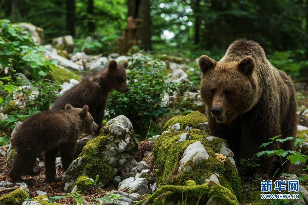 7月8日,三只棕熊在斯洛文尼亚南部诺特拉尼斯卡地区觅食。