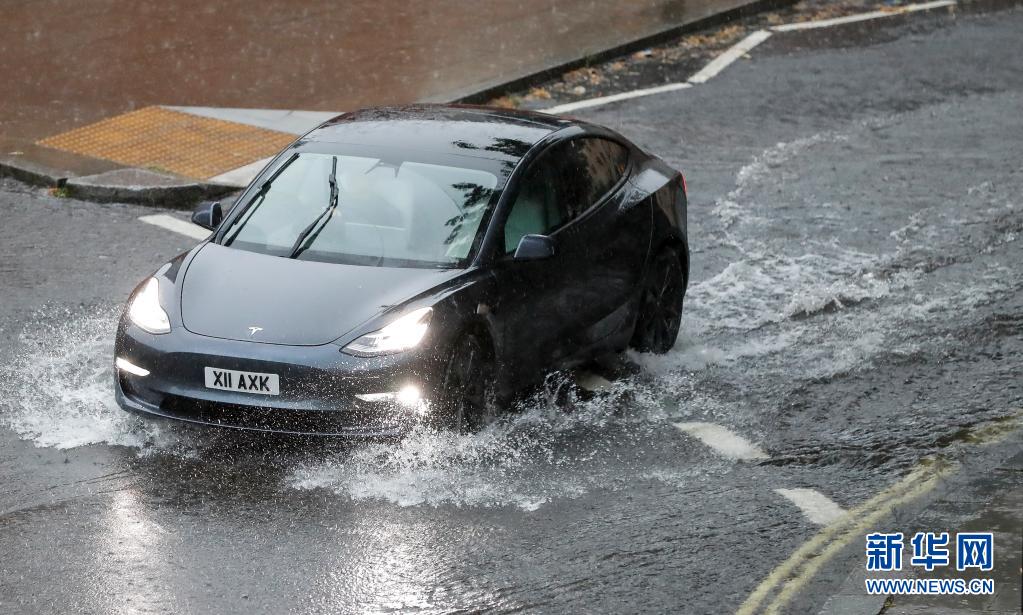 7月25日,一辆汽车在英国伦敦积水的路面上行驶。