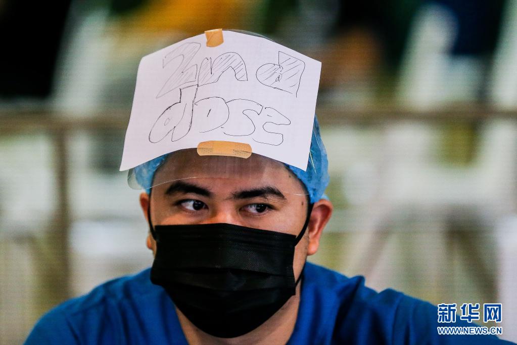 7月27日,在菲律宾圣胡安一个新冠疫苗接种点,一名医务人员头戴写有“第二针”字样的标识,引导人们接种疫苗。菲律宾卫生部27日报告,该国新增新冠确诊病例7186例,累计确诊1562420例。新华社发(乌马利摄)