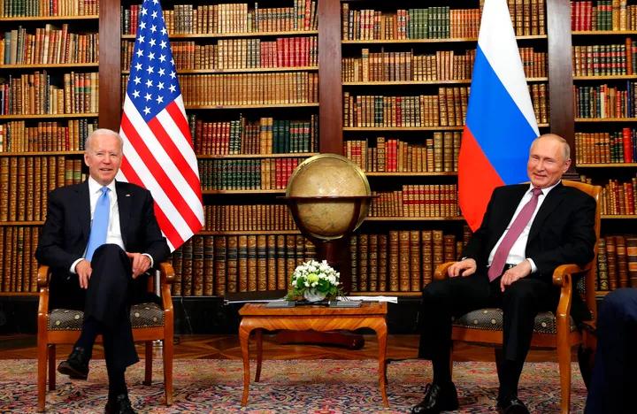 6月16日,美国总统拜登(左)和俄罗斯总统普京在瑞士日内瓦的拉格朗热别墅举行会晤。新华社发(Pool图片,丹尼斯·巴利布斯摄)