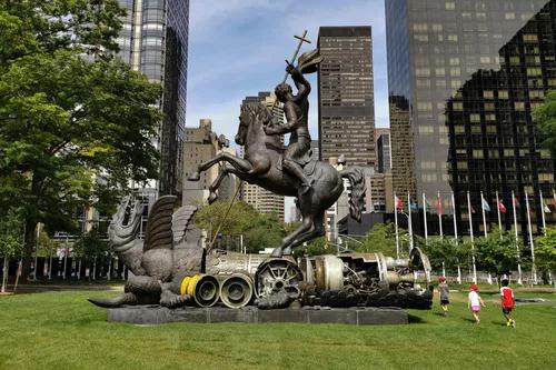 这是2019年8月5日在位于纽约的联合国总部拍摄的“善战胜恶”雕塑。这尊雕塑是前苏联1990年为纪念《中导条约》签署和联合国成立45周年特地赠送给联合国的。新华社记者 李木子 摄