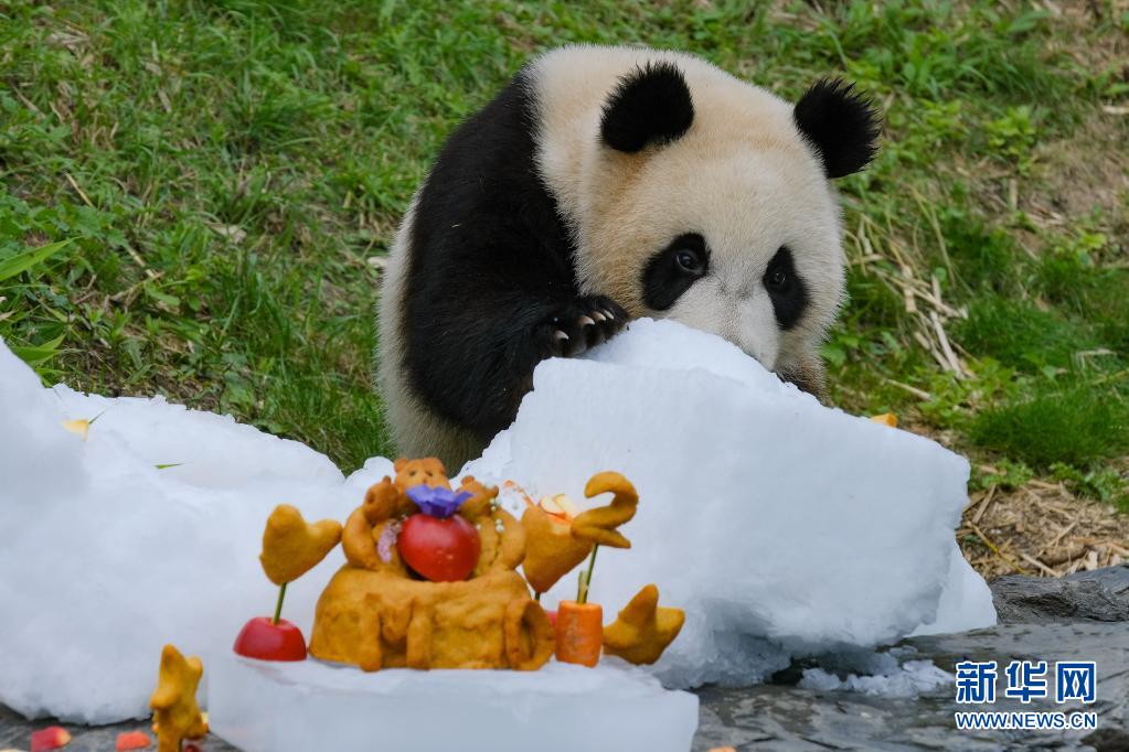 8月8日,大熊猫“宝妹”在比利时布吕热莱特天堂动物园准备享用“生日蛋糕”。
