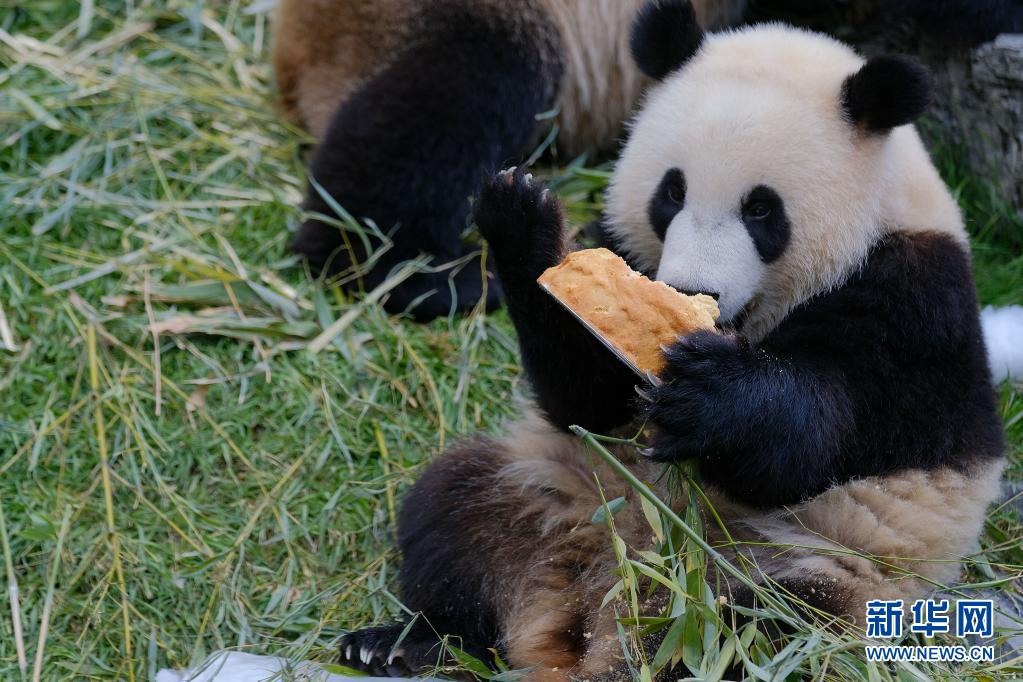 8月8日,大熊猫“宝弟”在比利时布吕热莱特天堂动物园享用“生日蛋糕”。