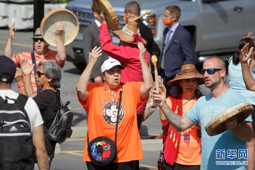 8月10日,在加拿大北温哥华“圣保罗印第安寄宿学校”旧址,人们在新闻发布会后击鼓、唱歌。