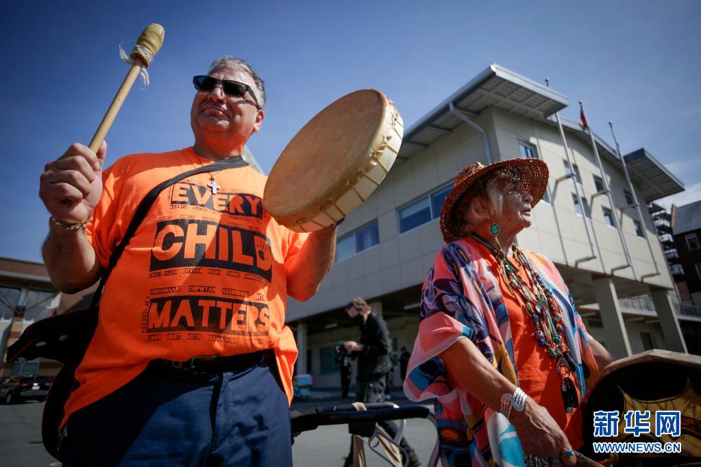 8月10日,在加拿大北温哥华“圣保罗印第安寄宿学校”旧址,人们在新闻发布会后击鼓。