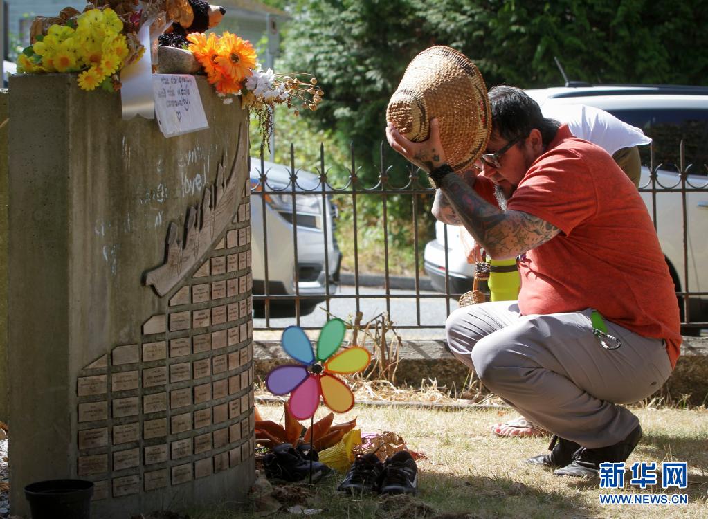 8月10日,在加拿大北温哥华“圣保罗印第安寄宿学校”旧址,一名男子在刻有失踪原住民儿童名字的纪念碑前脱帽致意。
