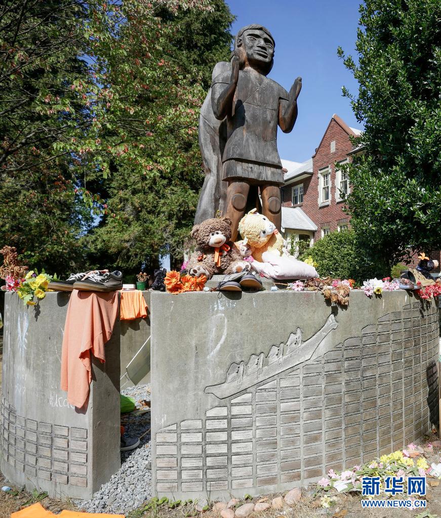 这是8月10日拍摄的加拿大北温哥华“圣保罗印第安寄宿学校”旧址内刻有失踪原住民儿童名字的纪念碑。