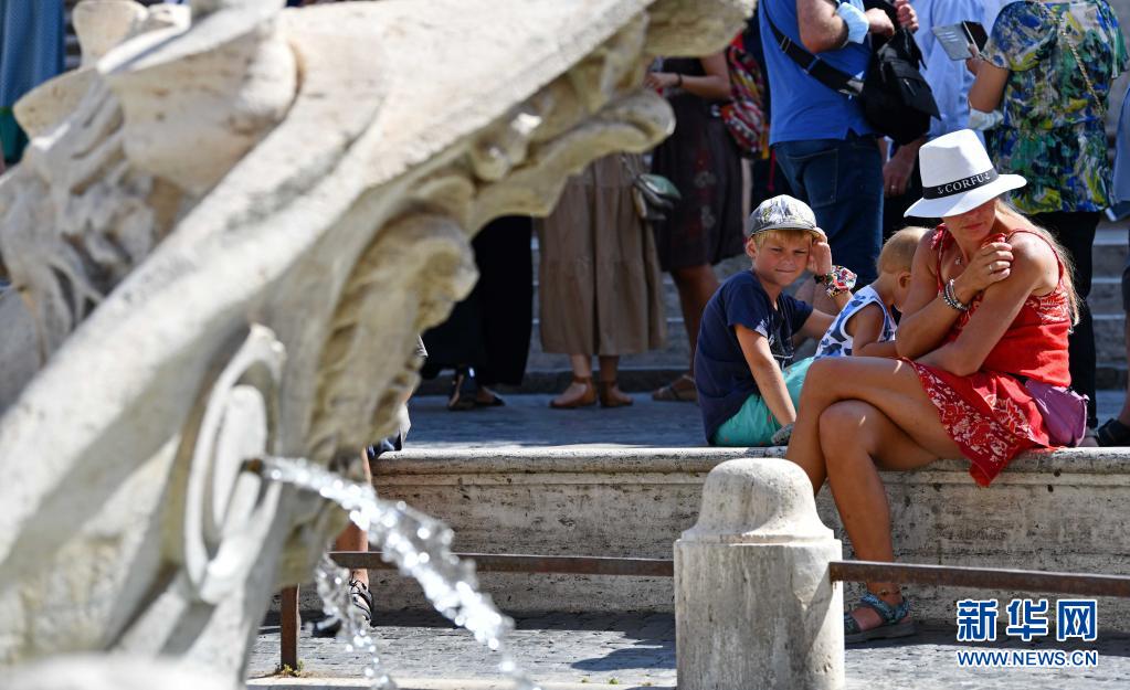 8月12日,游客坐在意大利罗马西班牙广场的喷泉旁。