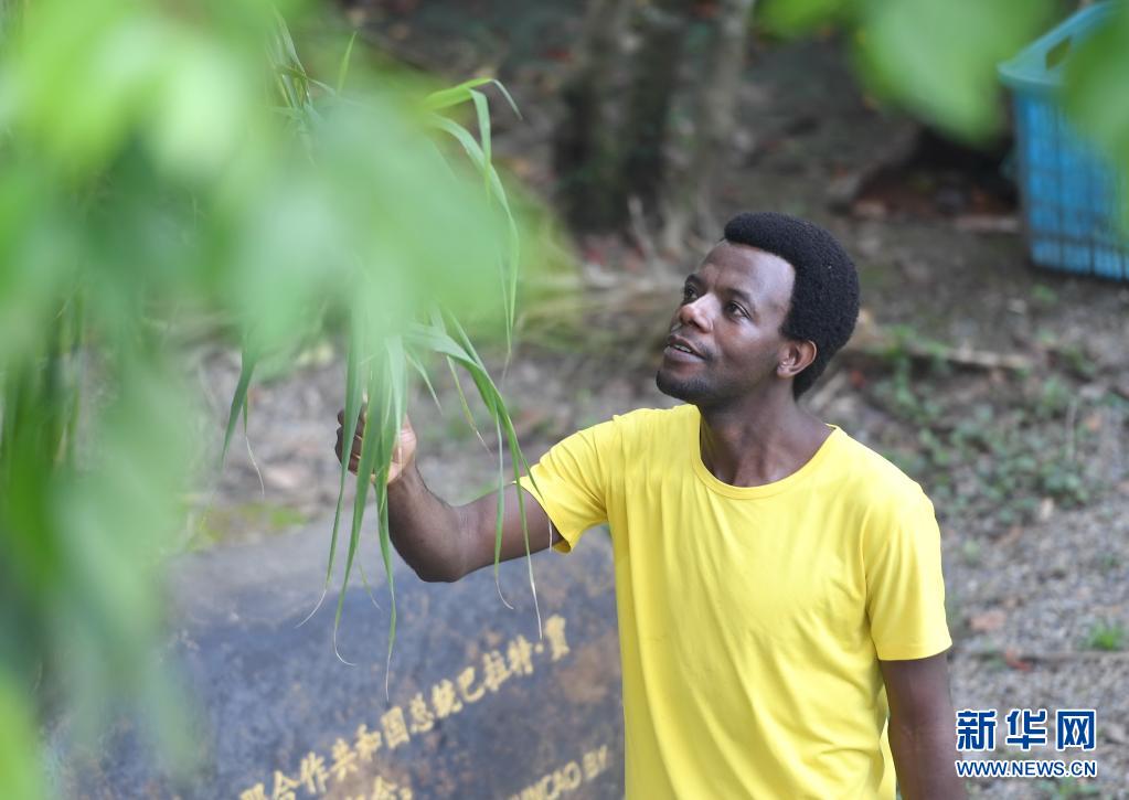 8月12日,卢旺达留学生欧贝德·尼伊姆巴巴兹在观察巨菌草的生长情况。