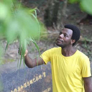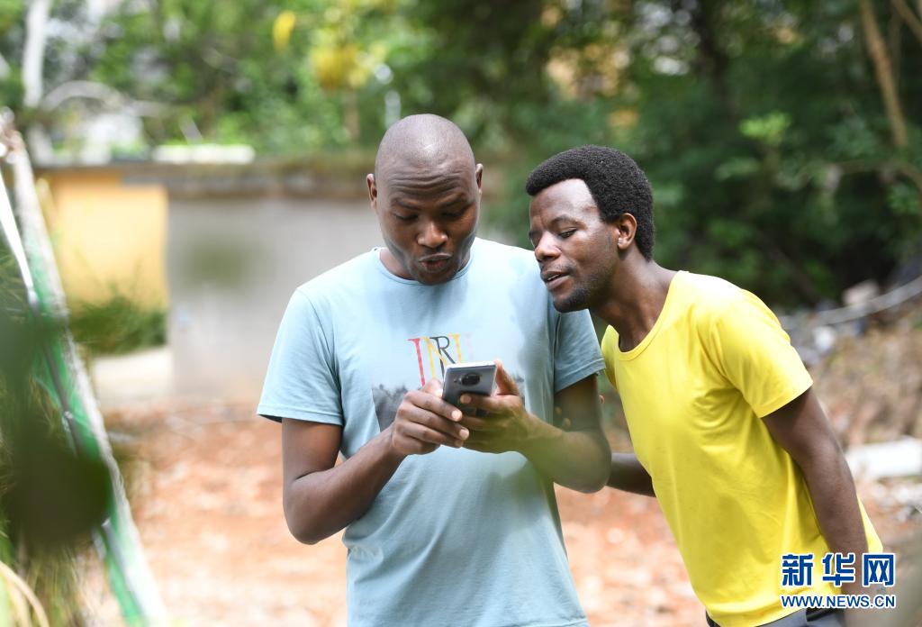 8月12日,卢旺达留学生欧贝德·尼伊姆巴巴兹(右)和肯尼亚留学生艾亚利拉·雅各布·奥卡尔在观看手机里有关菌草的视频。