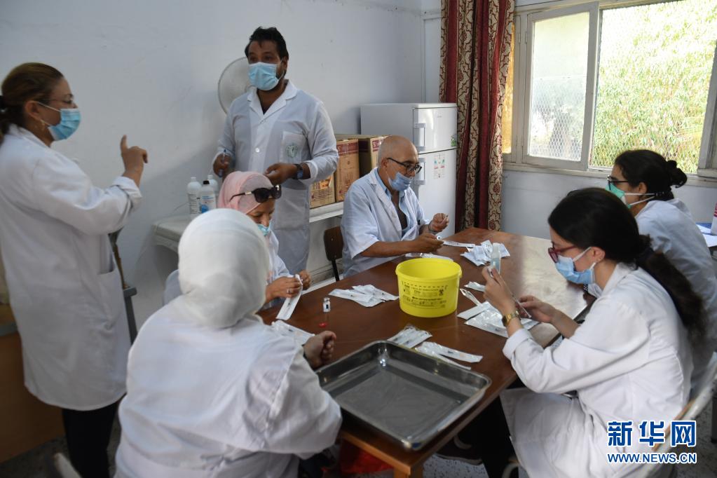 8月15日,医务人员在突尼斯首都突尼斯市一个接种点做新冠疫苗集中接种的准备工作。