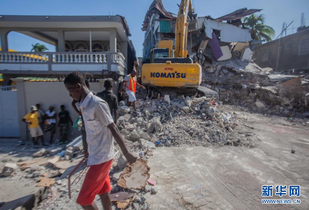 8月15日,人们在海地莱凯清理地震造成的建筑废墟。