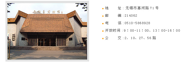 无锡市博物馆是一座综合性地方历史艺术博物馆,座落在具有深厚历史文脉的惠泉山下,古运河畔,馆藏文物近3万余件,内容涉及陶瓷、玉器、青铜器、金银、漆木、织绣、书画和大量近现代文物,其中尤以地方历史文物和明清书画藏品最富特色,丰厚绵长的历史底蕴赋予了她无穷的文化魅力,使她成为一座中华民族传统文化的宝殿。