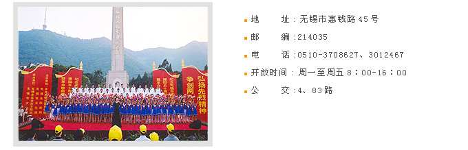 座落在惠山北麓的无锡市革命烈士陵园,始建于1953年。占地6.96万平方米,由大门广场、甬道、祭扫广场、烈士墓区、纪念碑亭及烈士事迹陈列馆等部分组成。
