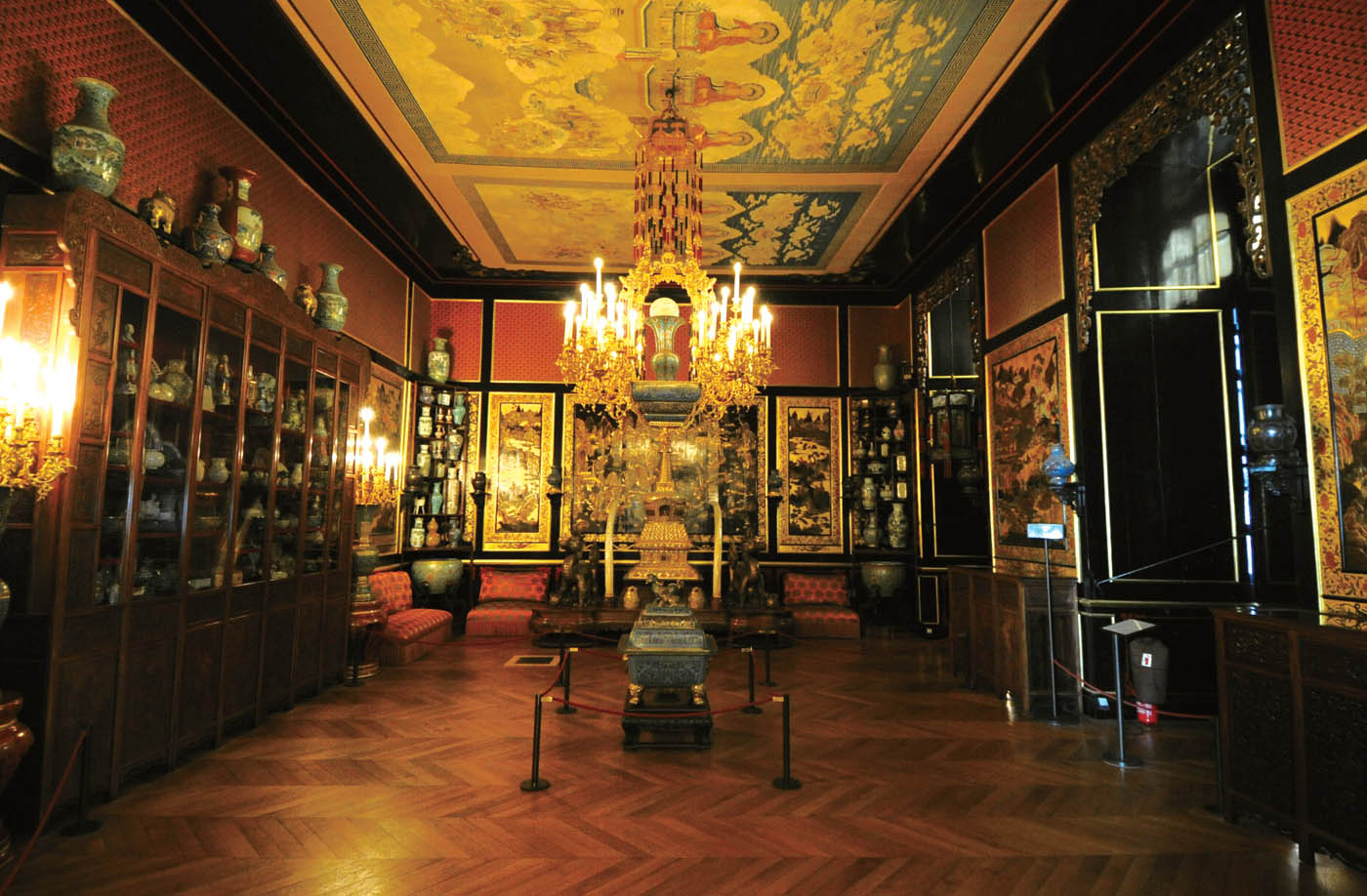 这位出生于西班牙格林纳达贵族家庭的皇后,当时与奥地利的伊丽莎白皇后(即茜茜公主)并称为欧洲两大美人。1861 年,欧也妮皇后在枫丹白露巡游时,要求建筑师阿莱克斯巴卡乐为她修建一个大型会客厅,用来收藏来自远东的艺术品。由此,枫丹白露便有了根据女主人鉴赏习惯布置的中国文物厅,以黑色与金色为基调作为装饰。其中,客厅天花板下华丽的景泰蓝大吊灯给人印象深刻,这是设计者巴尔巴蒂突发奇想,用中国香炉盖改制而成。欧也妮皇后会客室里文物的摆放,体现出那个年代收藏者的共性,即喜爱繁复堆砌,不喜欢留白,根据物品的器形和可用空间,不管材质、年代,全部填满了事。馆内存放着一对金瓶,非圆明园藏品,而是中国皇帝的赠予。难怪欧也妮皇后曾感叹:“每年中国皇帝都不忘赠送珍宝玩物为我庆祝生日,而我回赠的却是军队。”