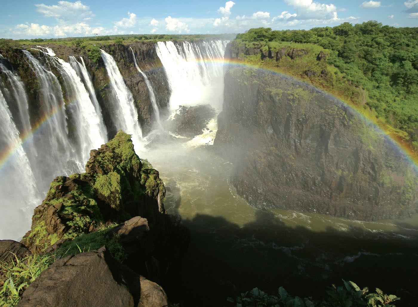 和酒店迎面相对的维多利亚瀑布,是世界上最大的瀑布。1855 年,一位名叫戴维·利文斯顿的英国传教士,划着一叶独木舟在赞比亚河上顺流而下,他突然发现,这条气势磅礴的大河瞬间消失了,滔滔河水倾泻进令人恐怖的深渊里。他后来在日记中写道:“我不明所以,于是战战兢兢地爬到悬崖边缘,看到一个巨大的峡谷,把那条1000 多米宽的河流拦腰截断,使河水下坠了有100 米。”死里逃生的利文斯顿,是第一个亲眼看到这条瀑布的白人(或许还有看到了瀑布却未能生还的欧洲人),他惊喜地向英国王室报告自己的地理大发现,并以女王的名字为这个瀑布命名。