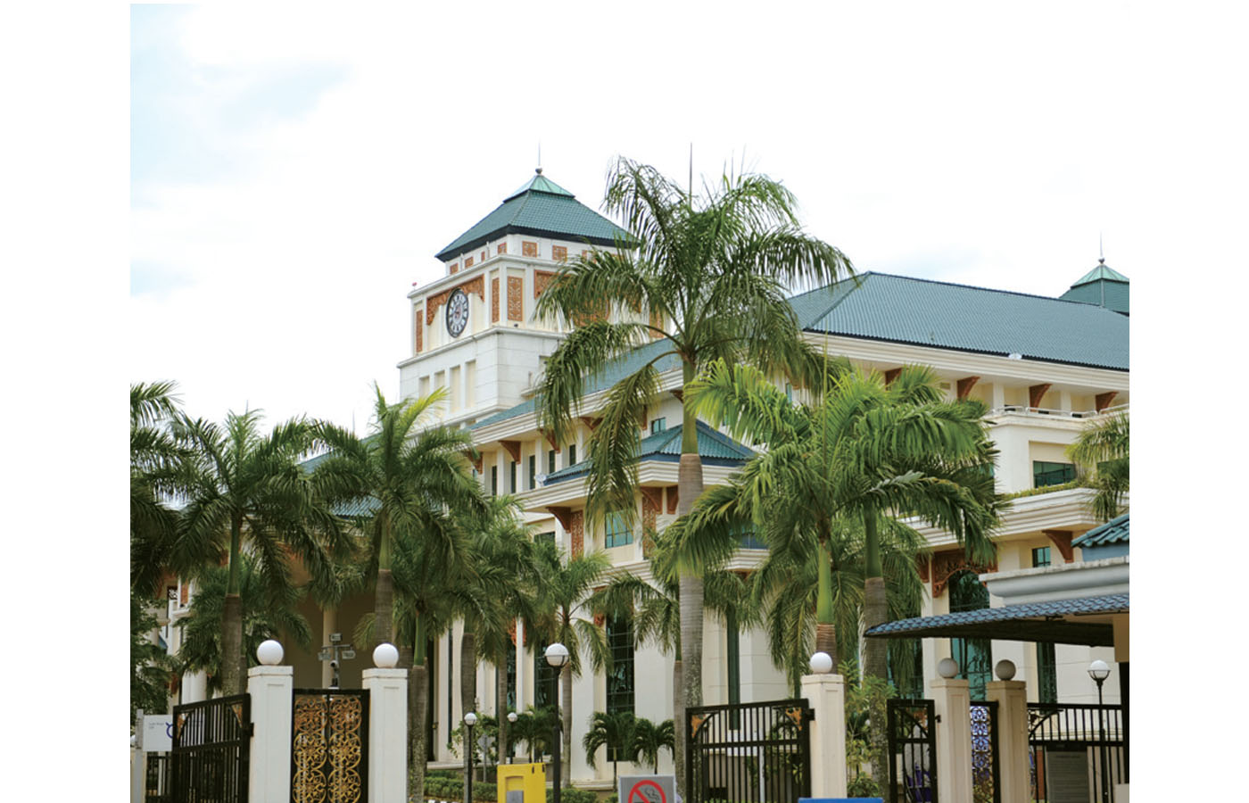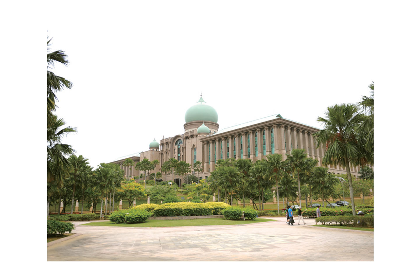 首相府不在吉隆坡老城区。为了缓解首都人口、交通压力,上世纪90 年代,马来西亚在距吉隆坡25 公里外的太子城,新建了国家行政中心,首相府和内阁各部都搬到这里。据我所知,在东南亚国家还鲜有如此整齐划一的首都行政区。新首相府的屋顶是夸张的绿色圆顶,在热带雨林中凸显着阿拉伯风格,提醒人想起,伊斯兰教是马来西亚的国教。在首相府工作人员安排下,5 月18 日下午,我们来到纳吉布的首相办公室。