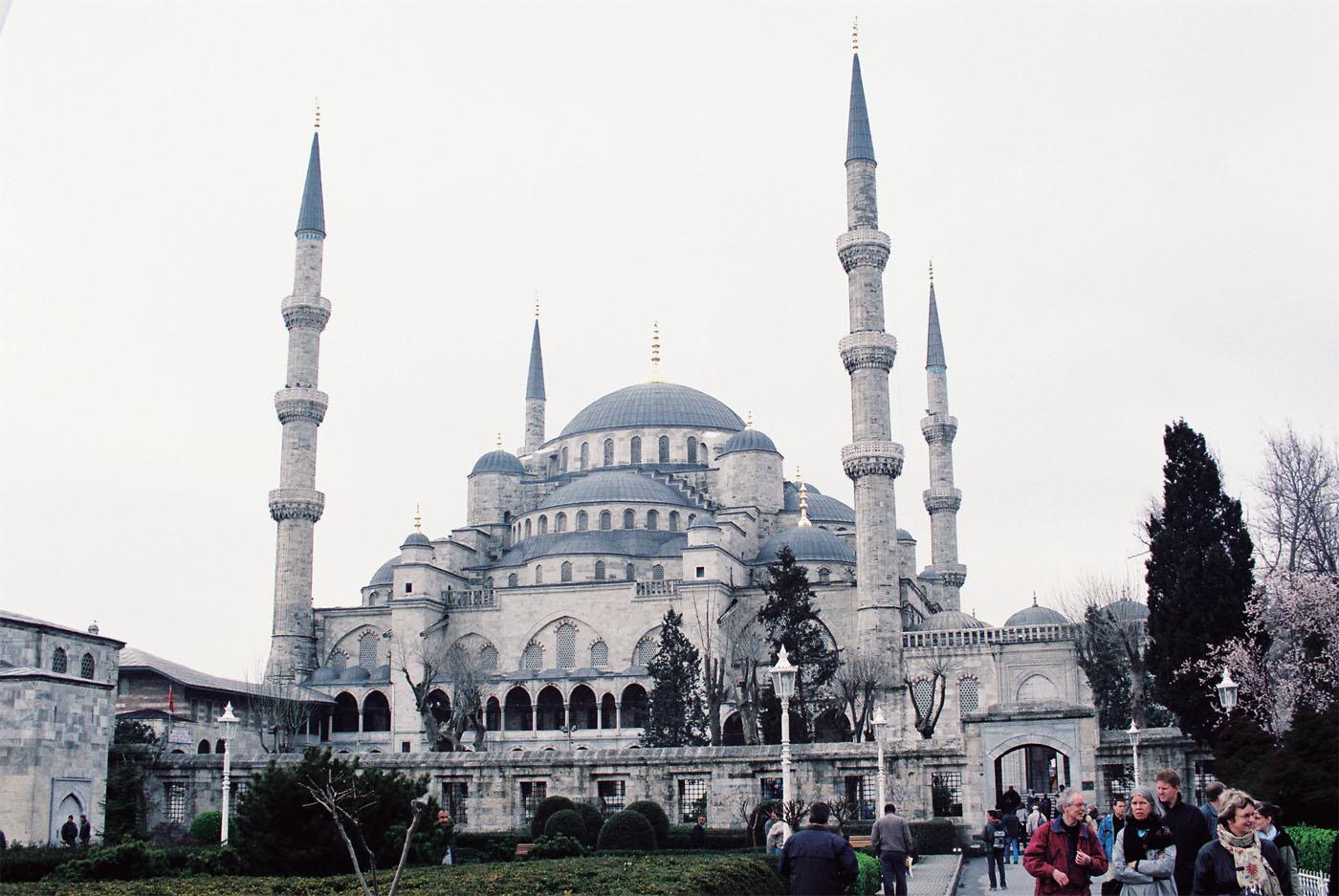 在西进的过程中,突厥人接受了一种新的宗教,就是由阿拉伯半岛游牧民族创立的伊斯兰教。他们把这种新宗教带进了伊斯坦布尔。我亲眼见到,基督教堂在这里被硬生生地改成清真寺。游览圣地索菲亚大教堂,是拜占庭帝国皇帝查士丁尼于公元537 年建成的基督教堂,被公认为是整个基督教历史上最恢弘的建筑。当年奥斯曼苏丹穆罕默德懂得这座建筑的文物价值,在战火中刻意把它保留下来,只是换了名称,拆除牧师讲道台,改作穆斯林礼拜的场所,昔日的基督教堂里从此每天五遍回响着《古兰经》的诵读声。直到今天,这座穹顶宏大的建筑门廊墙皮剥露处,仍露出基督教题材的镶嵌画。