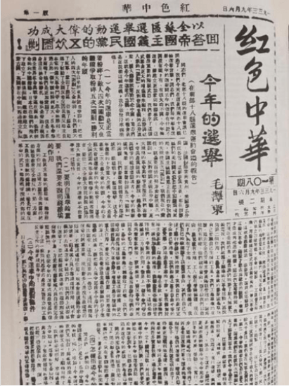 毛泽东同志在《红色中华》报上发表的署名文章和以其名义签发的政策文件约200篇。图为1933年9月6日《红色中华》报刊登的毛泽东同志文章《今年的选举》。
