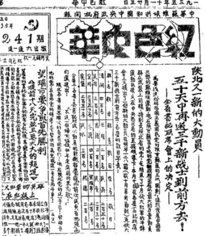 中央红军长征到达陕北后,1935年11月25日,红中社在瓦窑堡恢复新闻文字广播,《红色中华》报同日复刊。图为复刊后的《红色中华》报第241期,刊头沿用瑞金时期钱壮飞书写的美术体由于不知道长征后瞿秋白等同志在中央革命根据地仍继续出版《红色中华》报情况,因而复刊号接续长征前在瑞金时出版的期数。