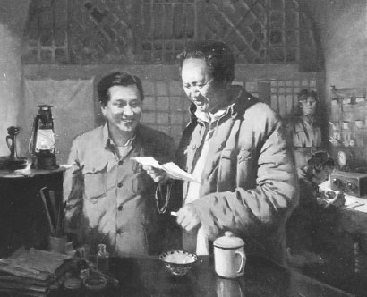 延安时期,毛泽东同志时常在夜晚十一二点钟来到新华社,看当天抄收的国内外电讯。图为画家戴泽根据廖承志回忆创作的油画,左为廖承志。