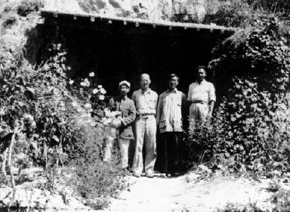 1944年9月1日,新华社英文广播正式开播。图为新华社副社长兼英播部主任吴文焘(右二)与编辑沈建图(右一)、陈庶(右四)、英籍专家林迈可在工作的窑洞前合影。