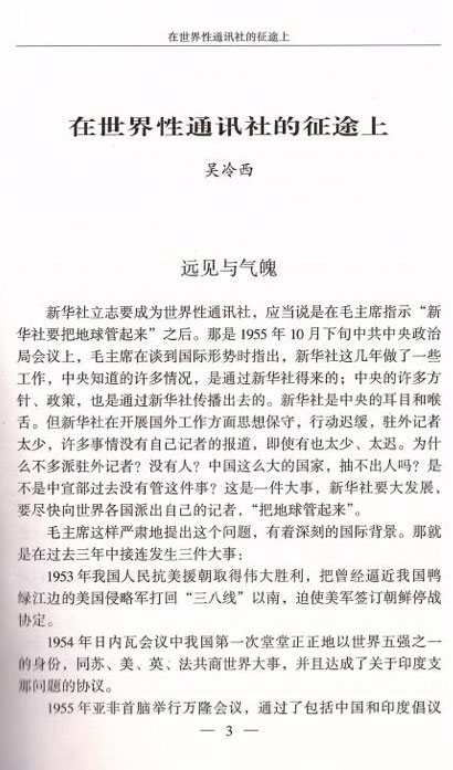 1955年,毛泽东同志提出,新华社要“把地球管起来,让全世界都能听到我们的声音”。图为新华社社长吴冷西的回忆。