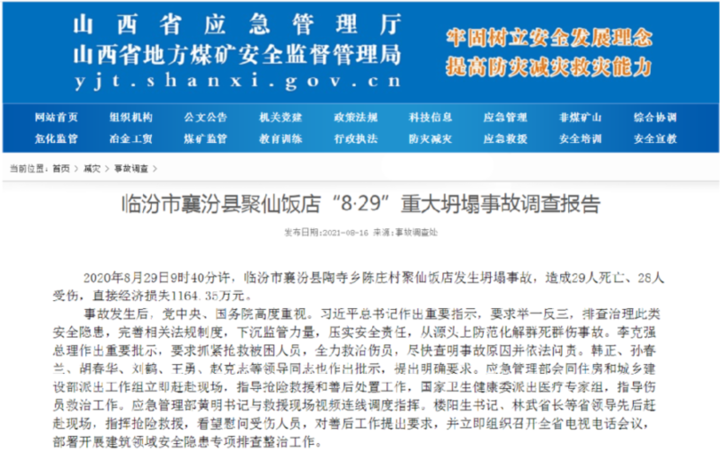 8月16日,山西省应急管理厅公布了临汾市襄汾县聚仙饭店 “8·29”重大坍塌事故调查报告。