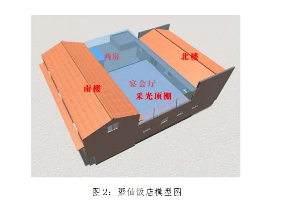 (一)饭店概况。聚仙饭店由襄汾县陶寺乡陈庄村村民祁建华经营,位于该乡陈庄村西、陶云线道路北侧(北纬35°53′45.78″,东经111°31′03.73″),是祁建华在其家庭承包责任田上自建的农村两层建筑物,占地面积1146.09m2(含北侧院落,合1.72亩),建筑总面积1157.05m2(含钢结构采光顶棚面积),投资共约39万元。建筑结构总体为砖混结构,局部为框架结构,主要组成部分为南楼、北楼、西房、宴会厅及钢结构采光顶棚。建筑物功能:宴会厅和北楼一层用于饭店经营,西房为厨房,南楼二层、北楼二层为居住用房,南楼一层为杂物房(聚仙饭店模型图见图2)。该饭店最初于1995年开始营业,2003年重新办理了营业执照,接待了半年散客之后,经营模式调整为只承接各类宴席,最大接待能力为27桌约200人。厨师为祁建华家人,承接宴席时临时聘用服务员。
