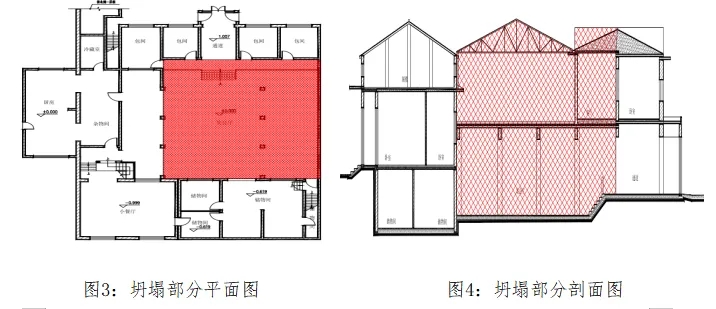 事故坍塌部分为宴会厅、北楼二层南半部分和钢结构采光顶棚,坍塌部分房屋建筑面积为252.59m2。(坍塌部分平面图见图3、坍塌部分剖面图见图4)