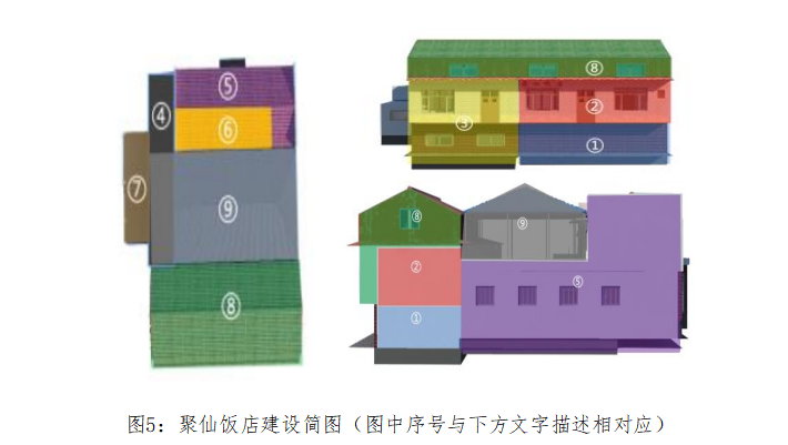 (二)建设情况。聚仙饭店所在建筑物最初于1993年建成,后经8次扩建,2016年建成现有规模,建设时间跨度23年(建设简图见图5)。历次建设均由无资质的包工头按照祁建华的要求承建或祁建华聘请亲朋好友自建,无专业设计、无工程监理、无竣工验收、无相关资料。