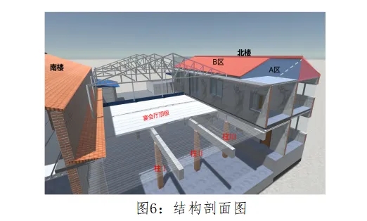 聚仙饭店结构整体采用砖混结构,楼面板、屋面板大部为预制板、局部为现浇板,纵横墙混合承重。北楼二层A区屋面板为预制板,东西向铺设,预制板中心处荷载最大;B区屋面板为现浇板;屋面板上方为高炉水渣保温材料,最厚处将近1米。宴会厅顶板由8根砖柱支撑,砖柱为包心砌法的空心砖柱,截面370毫米×370毫米,东北角柱Ⅲ荷载最大。(结构剖面图见图6)