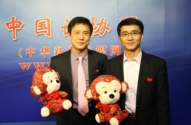 朝鲜中央通讯社首席记者 林正民(右)朝鲜劳动新闻首席记者 白山海。冯振宇摄