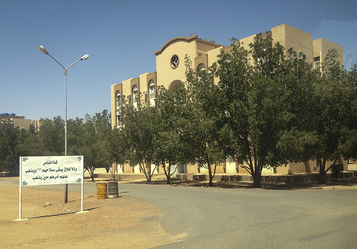 领行的苏丹同行带错了路,让我们有机会先到炼油公司的苏丹员工生活区走马观花。这里颇像中国的“工人新村”,遍布绿化,整洁宁静,完全不同于喀土穆市内或沿途所见村镇的环境,四层高的宿舍楼整齐排列,草木环绕,建筑风格则“中苏合璧”。道旁楼前树立着白底绿字的标语牌,其中一块用阿拉伯文写着:“团结能致成功,涣散必遭失败”。我们还看到了清真寺和幼儿园。工厂办社会,对身处沙漠的喀土穆炼油公司来说,也是必须之举吧。