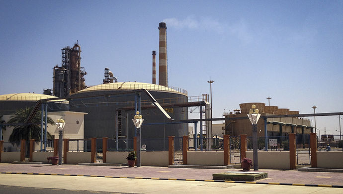 一个多小时后,汽车向右拐入岔道,经过一道有警卫盘查的栅栏门,伴着一条在沙地上延展的绿色林带继续前行。路的尽头出现了一片高低错落的“塔林”——那是各种石化装置留在地平线上的剪影。