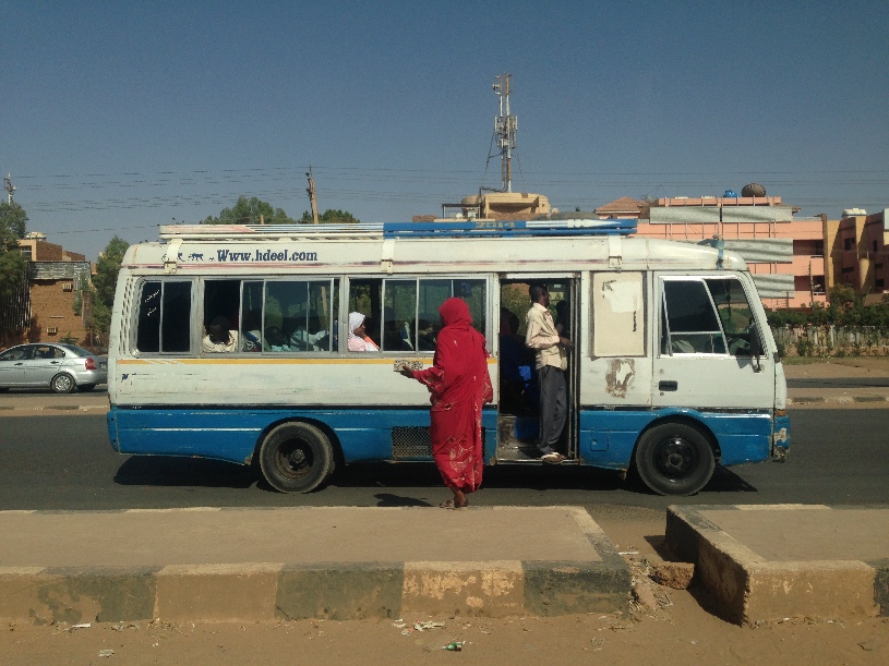 有趣的是,这些中小巴无论是停是行,都不关车门,扒在车门口的不光是大胆的小伙,也有无畏的大叔甚至大妈,个个镇定自若,御风而行一般。喀土穆有“世界热都”之称,夏季能热到摄氏50度,即便是“凉爽”的2月,白天也会有40度的高温,太阳嗮在脸上感觉发烫。也许,中巴大开车门,不仅上下更快捷方便,也利于通风借凉,节约空调。