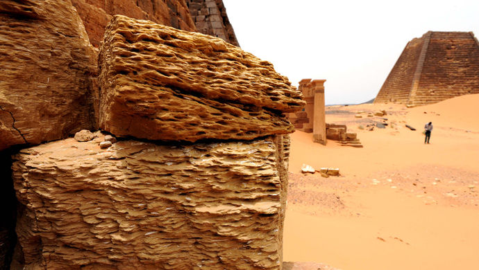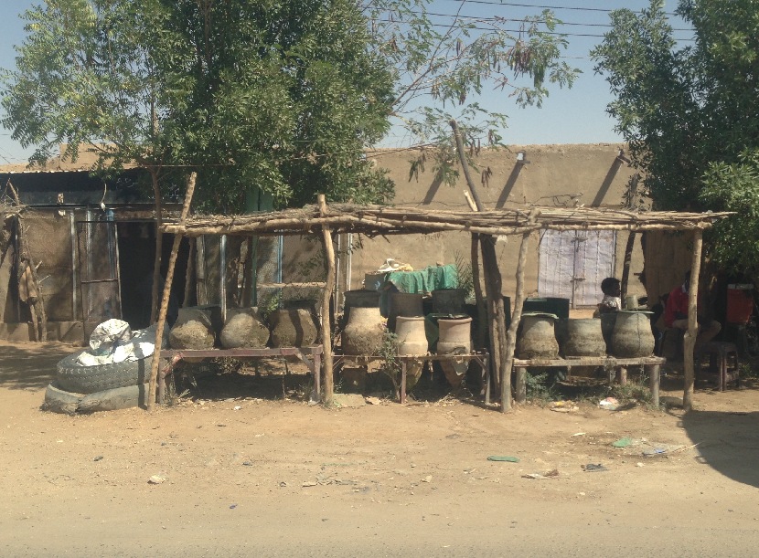 喀土穆北郊有连片的沙漠,一条公路孤单地穿行其中。经过村镇时,路两旁多见土坯建筑,把售卖各种货物的摊子,铺得紧挨路肩。也有些铁制或木制架子,上面搁着一排广腹尖底的大陶罐(按其体量,称之为“缸”可能更合适),盖子上压着舀勺——显然,罐里装着液体,应该是沙漠里最缺的水吧。