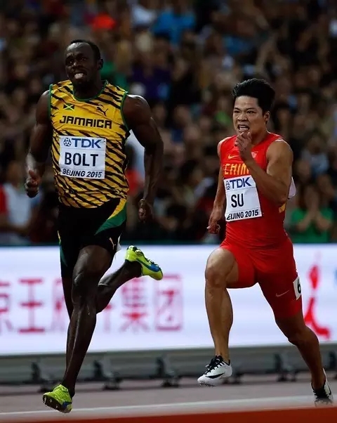 2015年8月23日,中国选手苏炳添(右)与牙买加选手博尔特在半决赛中。当日,在北京国家体育场“鸟巢”进行的2015年国际田联田径世锦赛男子100米半决赛中,中国选手苏炳添以9秒99的成绩晋级决赛。