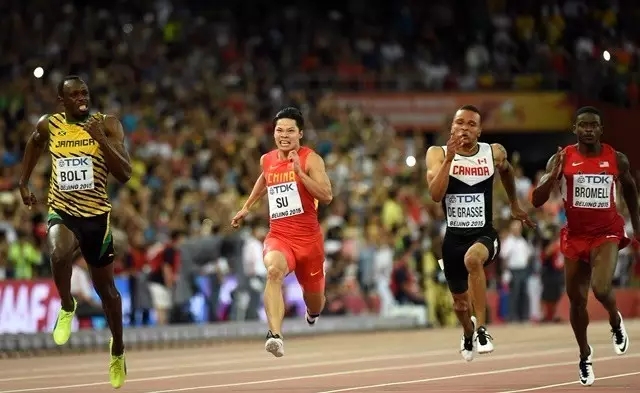 2015年8月23日,苏炳添(左二)与博尔特(左一)在半决赛中。当日,在北京国家体育场“鸟巢”进行的2015年国际田联田径世锦赛男子100米半决赛中,中国选手苏炳添以9秒99的成绩晋级决赛。