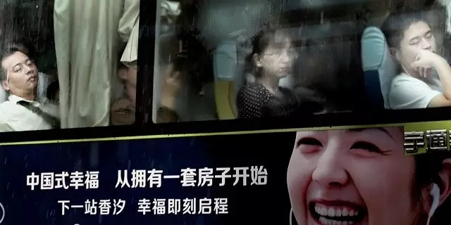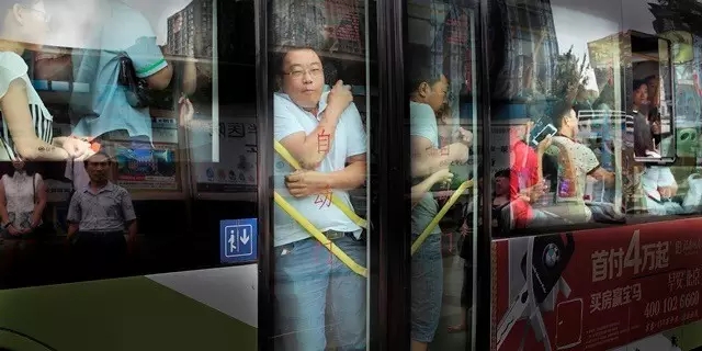 2014年7月9日,河北燕郊挤公交的跨省上班族。