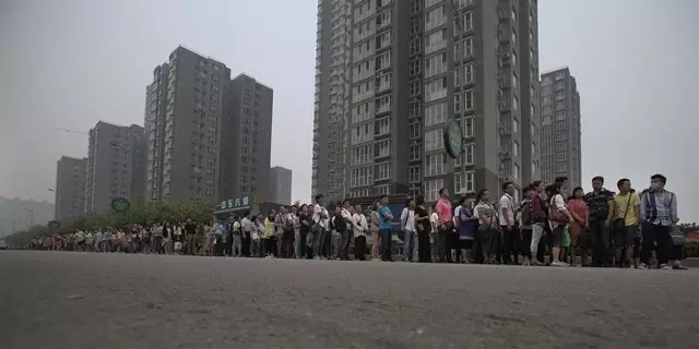 2014年6月16日,河北燕郊排队等待公交的跨省上班族。