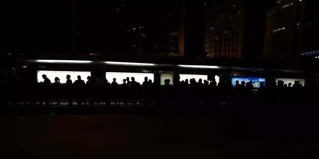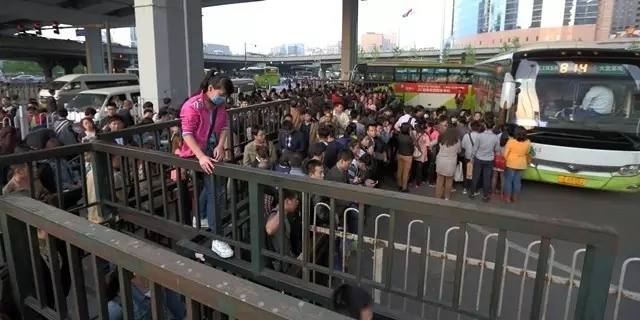 2015年4月22日,北京国贸桥下翻越栅栏乘公交车回家的跨省上班族。