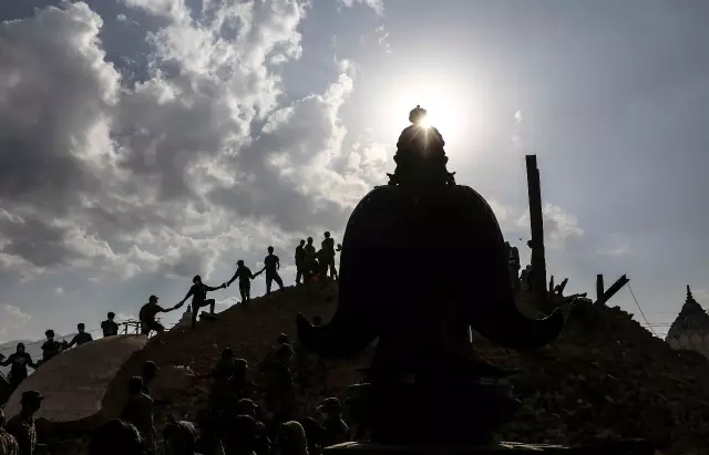 4月30日,尼泊尔加德满都,杜巴广场,当地居民和志愿者一起清理地震中倒塌的古建筑。