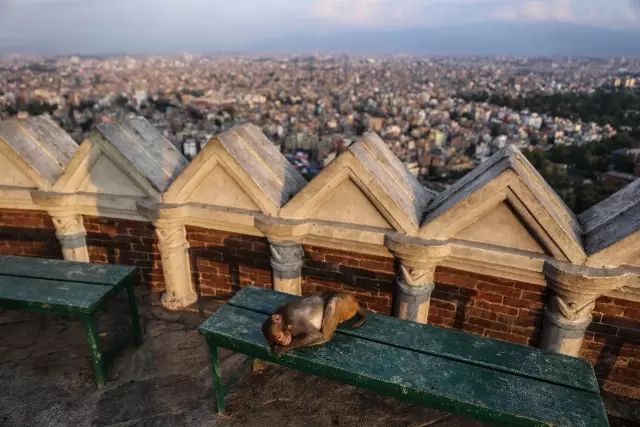 2015年4月30日,尼泊尔加德满都,损毁严重的斯瓦扬布纳寺(猴庙)上的猴子显得很伤心,斯瓦扬布纳寺(猴庙)是尼泊尔历史最为悠久的遗迹也是重要的佛教朝圣地,在8.1级大地震中加德满都很多古建筑被毁。