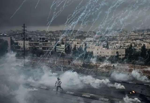 2015年11月6日,在约旦河西岸城市伯利恒,巴勒斯坦示威者在冲突中躲避以色列警察发射的催泪弹。