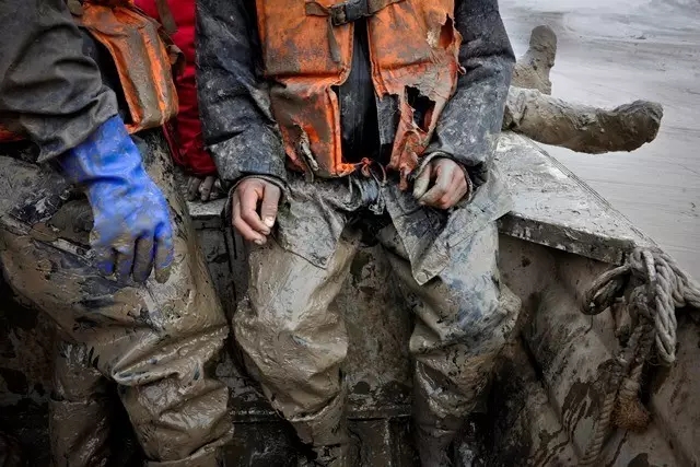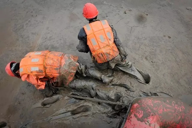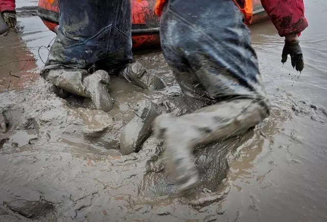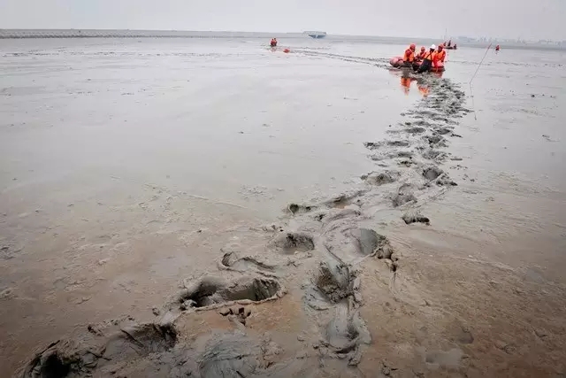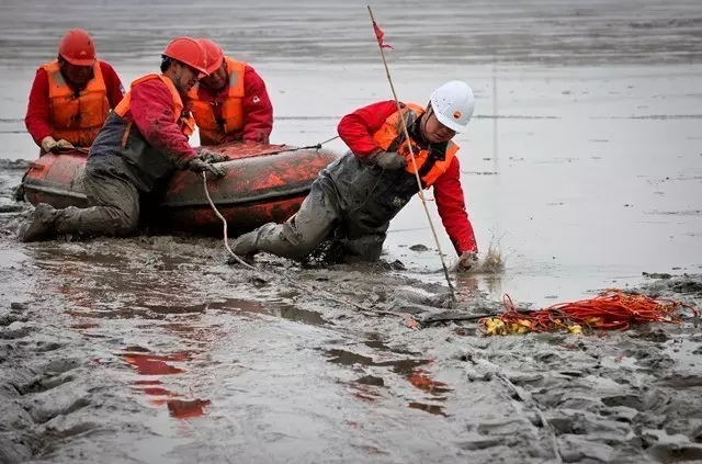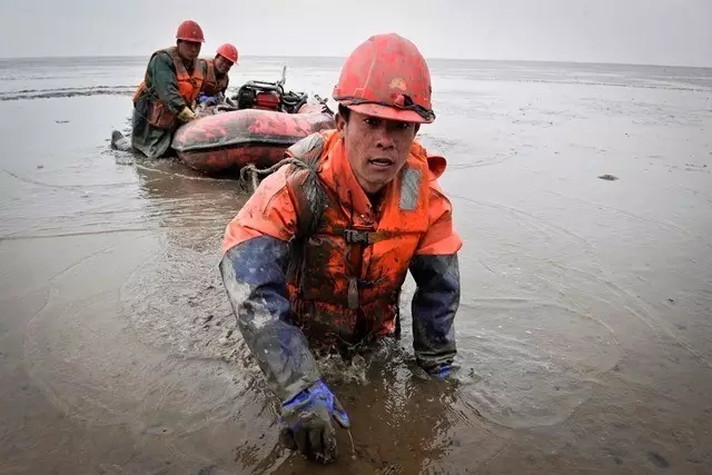 淤泥浅的地方没过膝盖,深的到大腿根。在这样的地方站着行走非常困难,这样跪着、爬着,增大受力面积才行。主管生产的副队长李锐告诉记者,队员每天要这样爬行3公里。