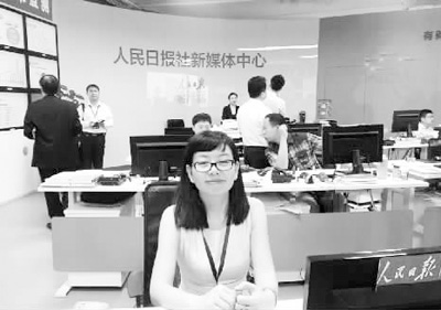 新加坡《南洋商界》杂志社社长、总编辑萧敏在人民日报社新媒体中心参观。