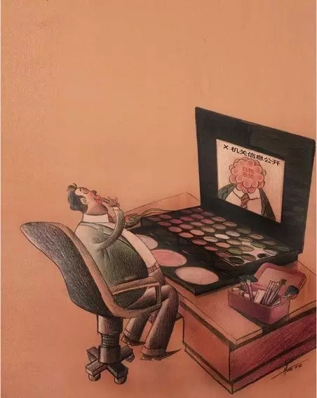 推荐理由:电脑键盘变成了化妆盒,电脑屏幕变成光荣花,政府部门网站应当更“实”一些,刻意粉饰,群众不会买账。漫画运用比喻手法,对这类现象进行了夸张的讽刺,现实意义很强。