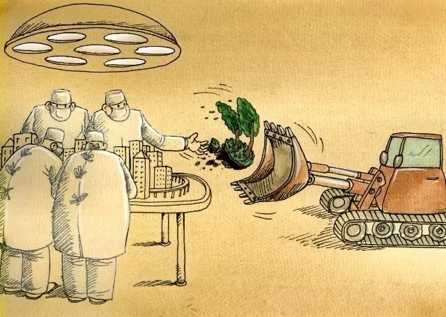 推荐理由:城市建设与城市发展和城市居民生活密切相关,然而有些城市的规划者缺乏整体考虑。这幅漫画用简洁的画面和色彩的强烈对比,勾勒出那些规划者将有益于城市发展和居民生活的绿化铲除,在经济利益的驱使下,把原本美丽的城市变成水泥森林,颇具警示意义。